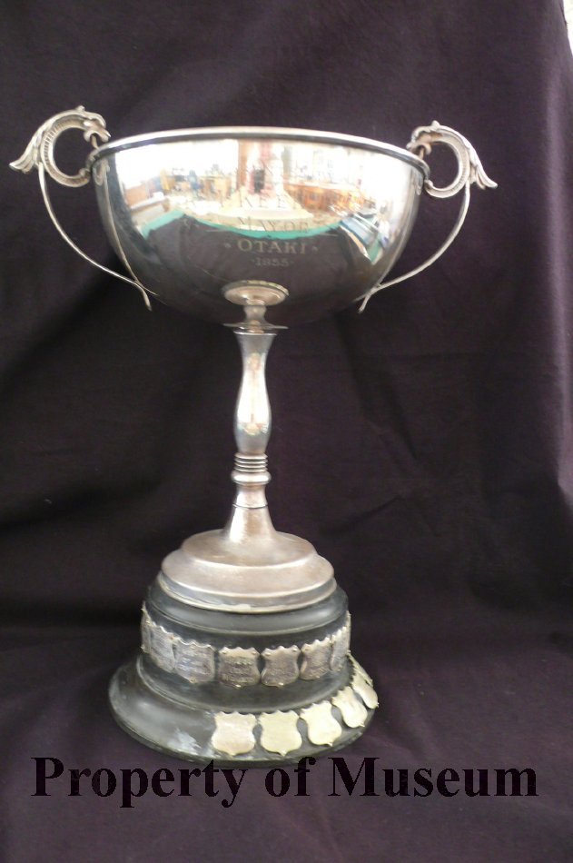 Engraved with the words "Presented By R. McKeen. Esq - Mayor Otaki 1955". Fixed to the base are 23 silver medallions engraved with date and club name.