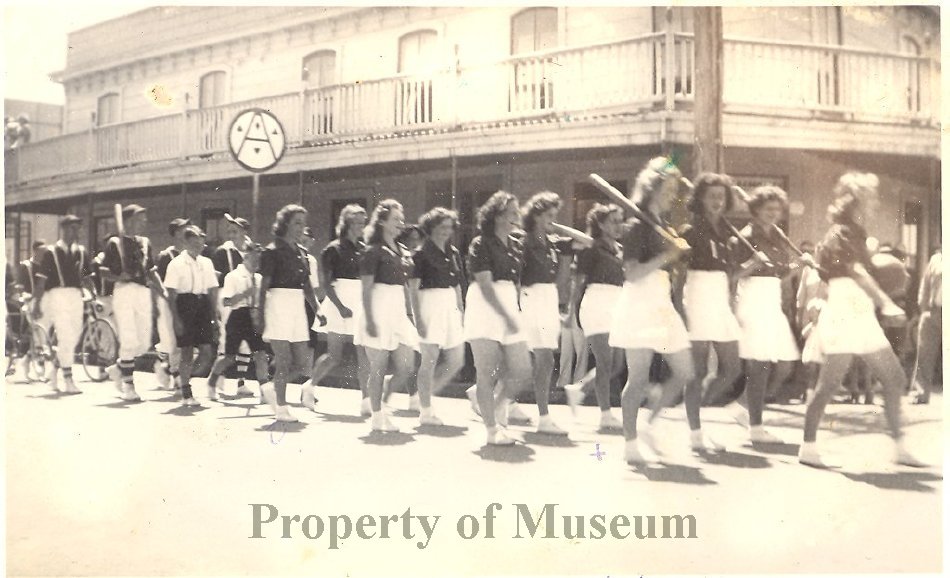 Women's softball team 1940s/50s, marching down Main Street.