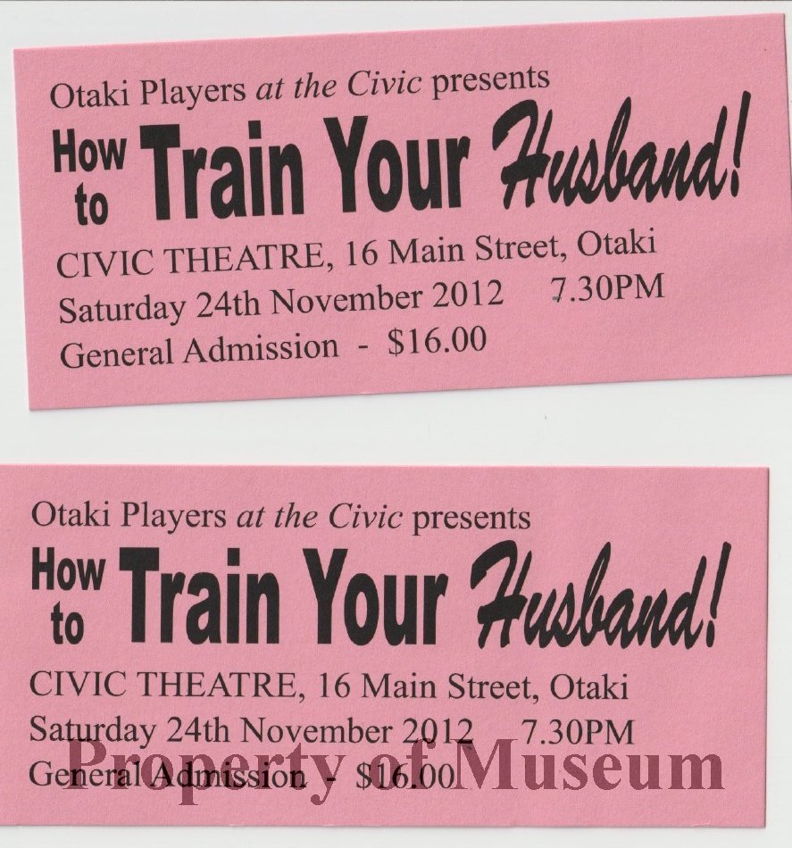 Tickets to the Otaki Players production of 'How to Train your Husband!', at the Civic Theatre, 7.30pm Saturday 24th November 2012.