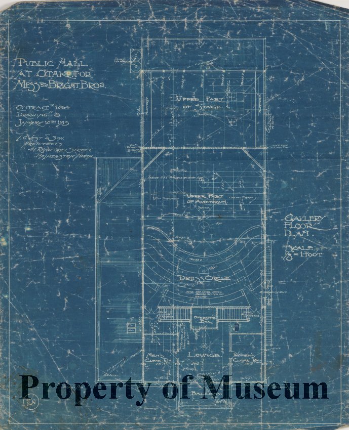 Gallery Floor Plan for Bright's Theatre by L G West & Sons Architects Ltd. Blue print.