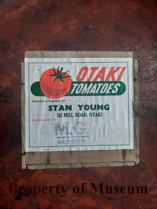 An empty 'Otaki Tomatoes' wooden tomato box with the label of Stan Young's market garden, 263 Mill Rd, Otaki. (1960-1980)