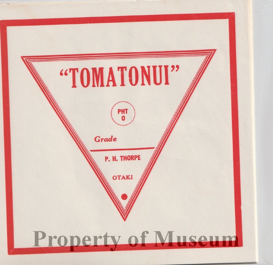 Labels for "Tomatonui", P H Thorpe's tomato market garden, Otaki.