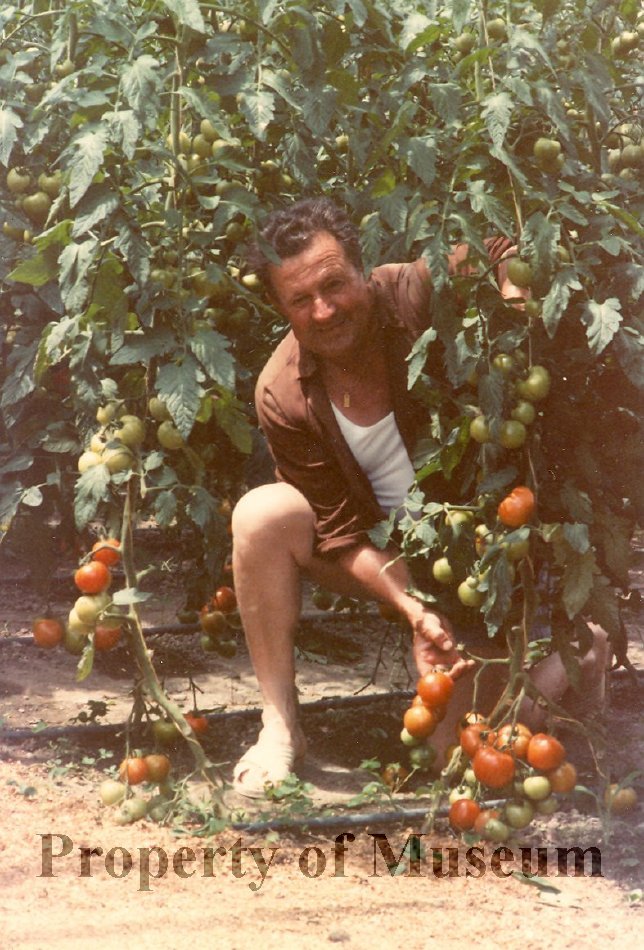 Peter Dal Din in his garden at 128 Waerenga Road, 1985.