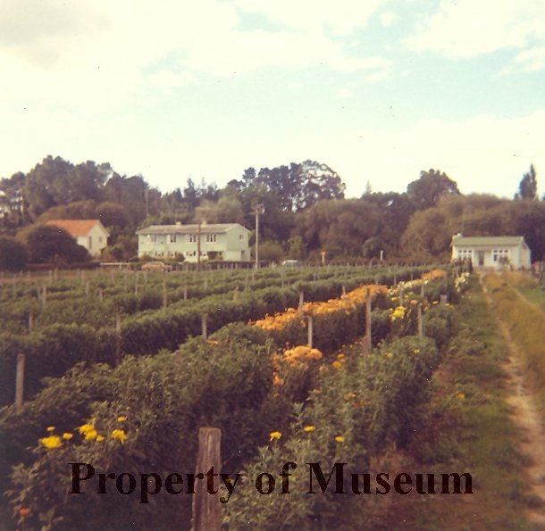 Chrysanthemums growing in Morgan's gardens, looking toward Mill Road, Otaki
