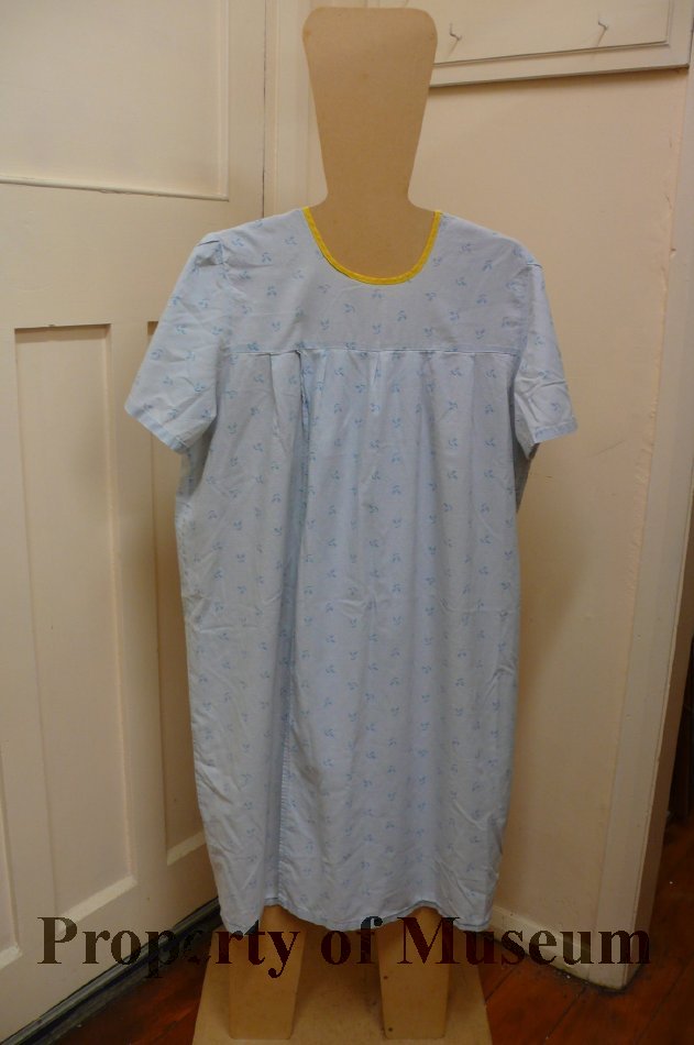 Hospital gown for maternity wear. The gown has short sleeves, short bodice with a pleated skirt attached and a front opening for ease of breastfeeding, also a back opening.