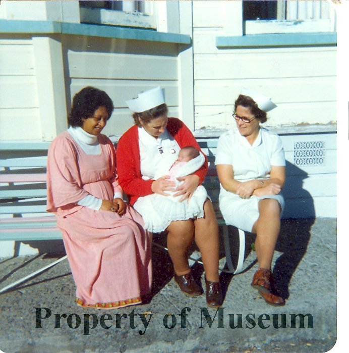 Diana Moffatt, Gloria Johnston holding baby Katherine Moffatt and Pam Snowden at Otaki Maternity Home, See OHJ vol 42 page 40