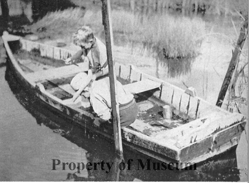 David Cook (with hat) and George Taucher playing in the Cook's Boat, Rangiuru Stream, 1940s.
