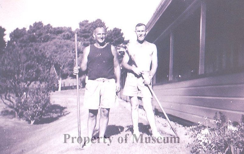 Bill Watson & Noel Bagant, keeping the gardens at the Otaki Sanatorium. 1953.