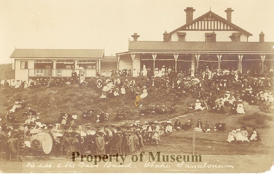 Otaki Brass Band and crowd at the Otaki Sanatorium, printed on a postcard.
