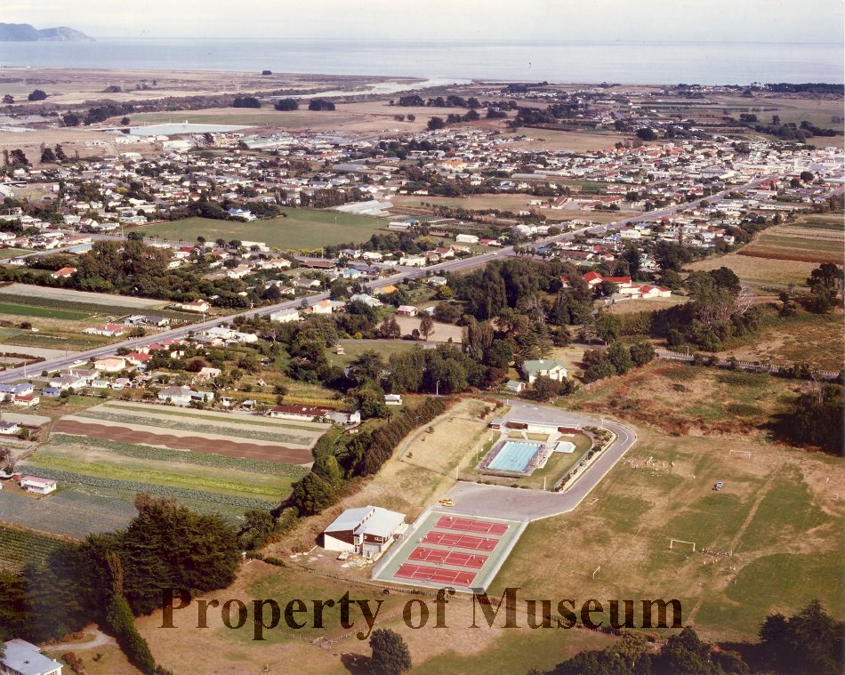 Newly built squash courts, swimming pool and soccer fields, c1982