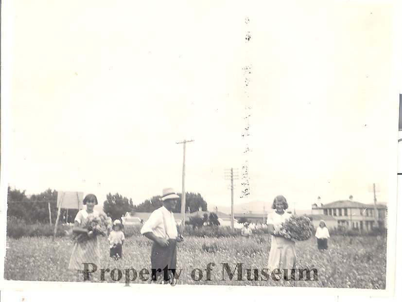 The Railway Hotel can be seen in the distance. Gathering flowers are Phylis and Ray Moffatt (children, left), Winston (man wearing braces and hat, centre) and three others (one probably Julia Moffatt, grandmother of Ray and Phyllis).