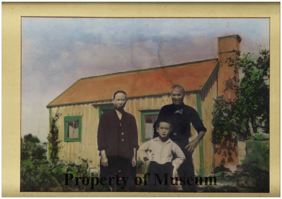 Framed hand painted photograph of Yung Kim and Chow Kim with their son Peter, outside their home, c1938.