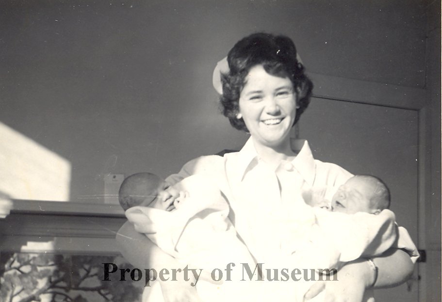 Sherryn Cole with two new born babies at Otaki Maternity Hospital, 1963