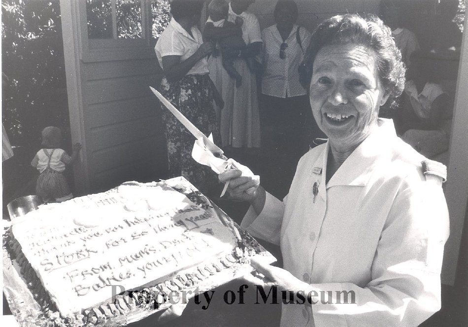 Sister Jo Harnett cutting her retirement cake after 25 years as midwife at Otaki Maternity Hospital.